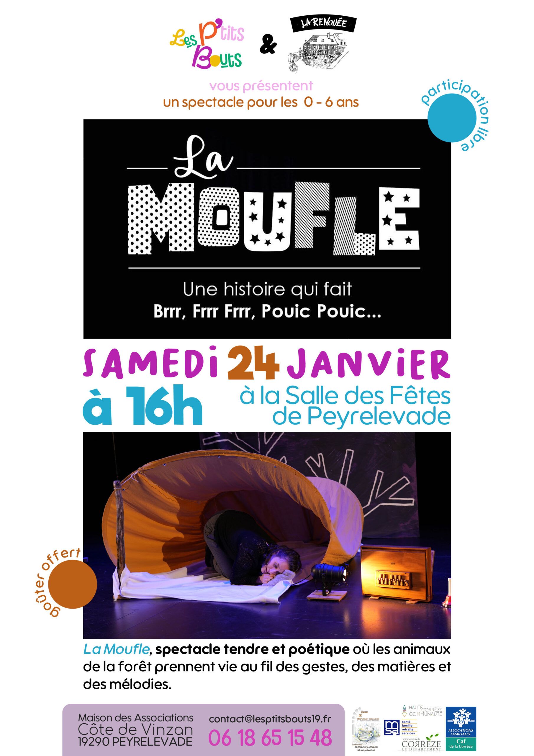 L’association Les p’tits bouts et La Bascule vous proposent un spectacle pour enfants (0-6 ans) le samedi 24 janvier à 16h à la salle des fêtes de Peyrelevade. « LA MOUFLE (du Théâtre de l’équinoxe) –… |